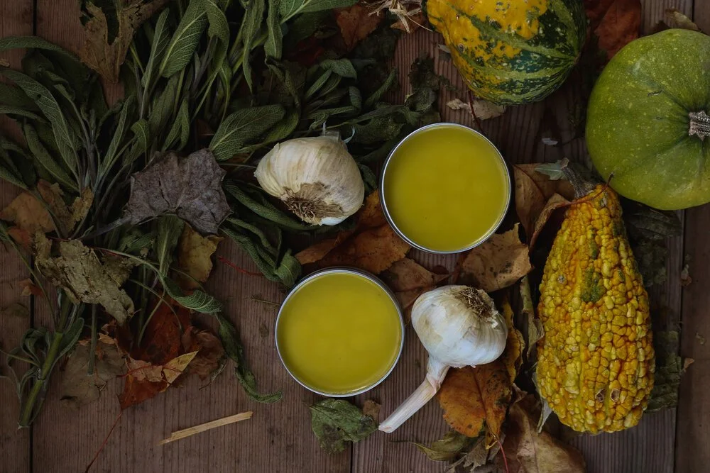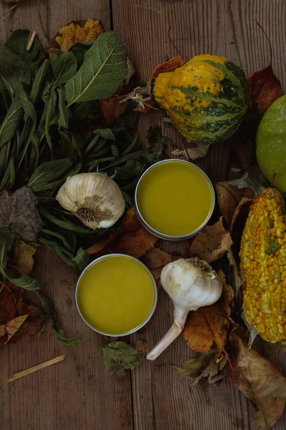 Carefully pour the salve into your selected tins. The garlic will sink to the bottom, and you should be able to slowly pour mostly liquid into your container of choice. It is alright if some chunks of garlic get into the salve, but try your hardest to not let them fall in.