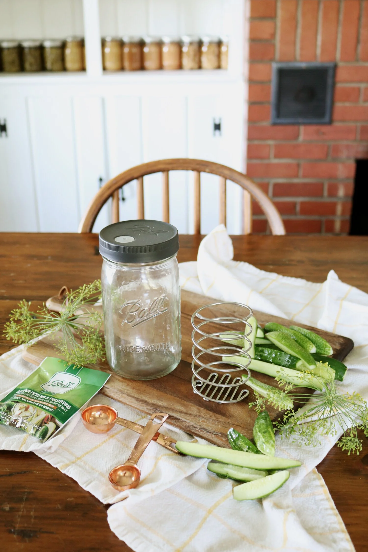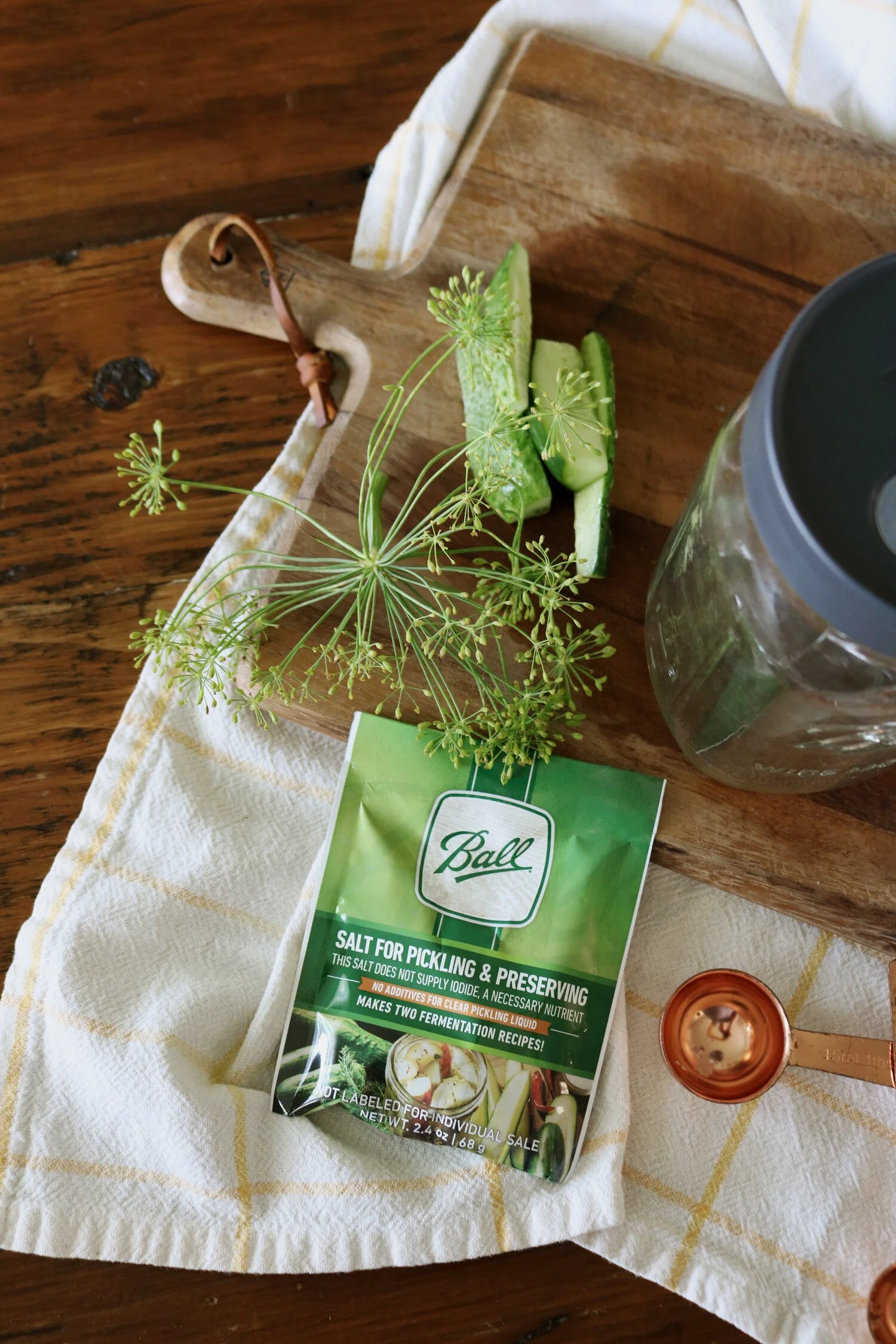 I am so excited to share this recipe! I have been wanting to try fermenting pickled cucumbers for a couple of years now, and it gives me such pleasure to work with Ball® Canning as one of their canning ambassadors, because that means I get to try new things like this. I just cracked open my jar the other day, and they are absolutely delicious. Why have I never tried fermenting pickles before?! If you are considering trying this yourself with your garden cucumbers, I highly recommend it. All you need is the new Ball® Fermentation Kit, which makes fermenting for beginners incredibly easy and worry-free.