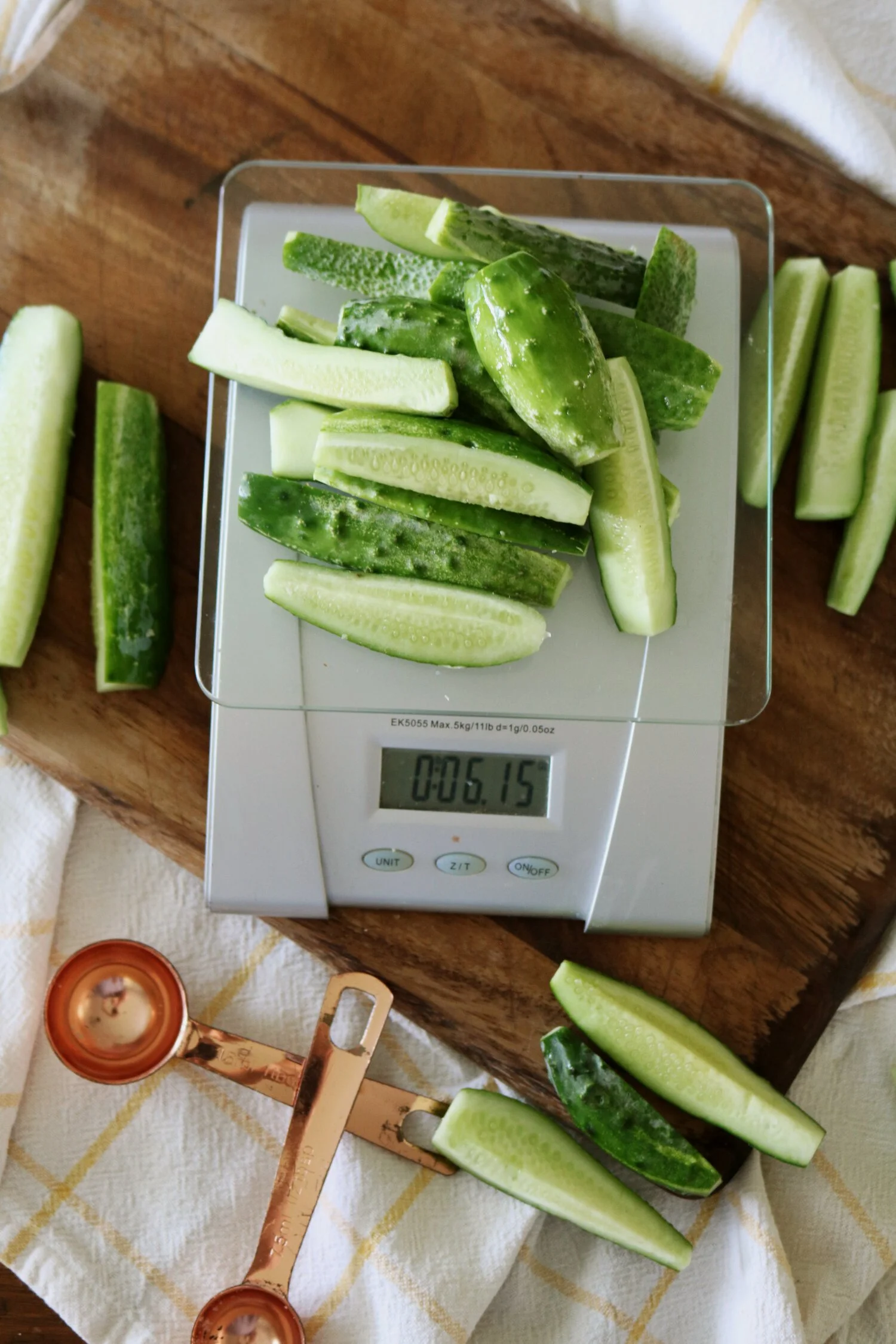 Wash the cucumbers and slice 1/16th inch off both ends. Slice cucumbers lengthwise into halves or quarters.