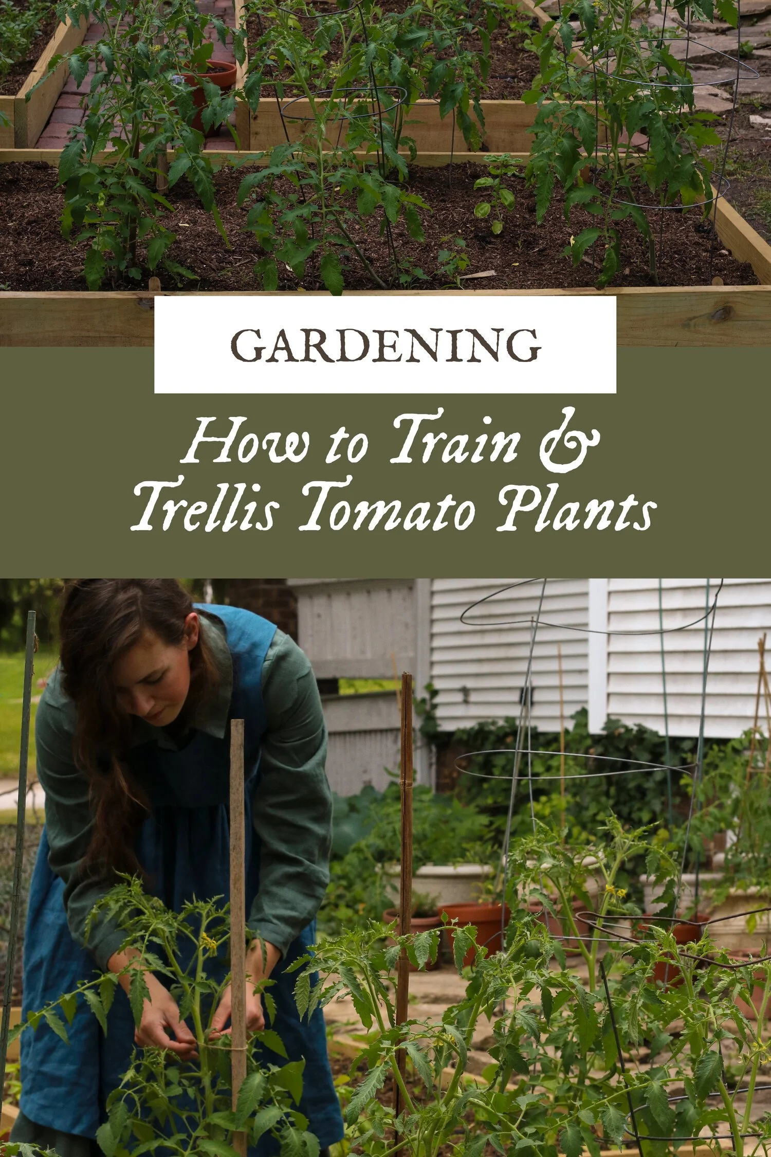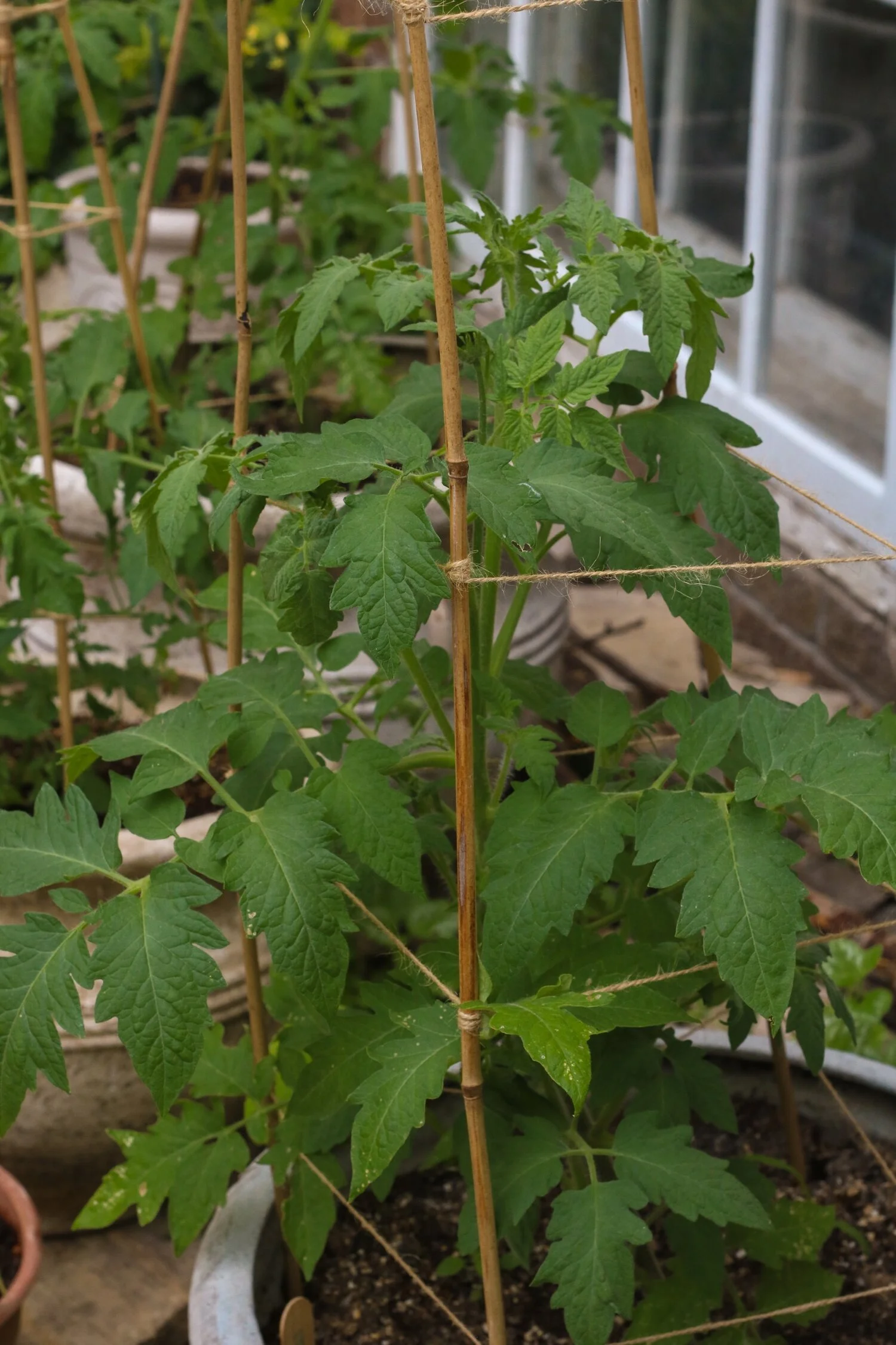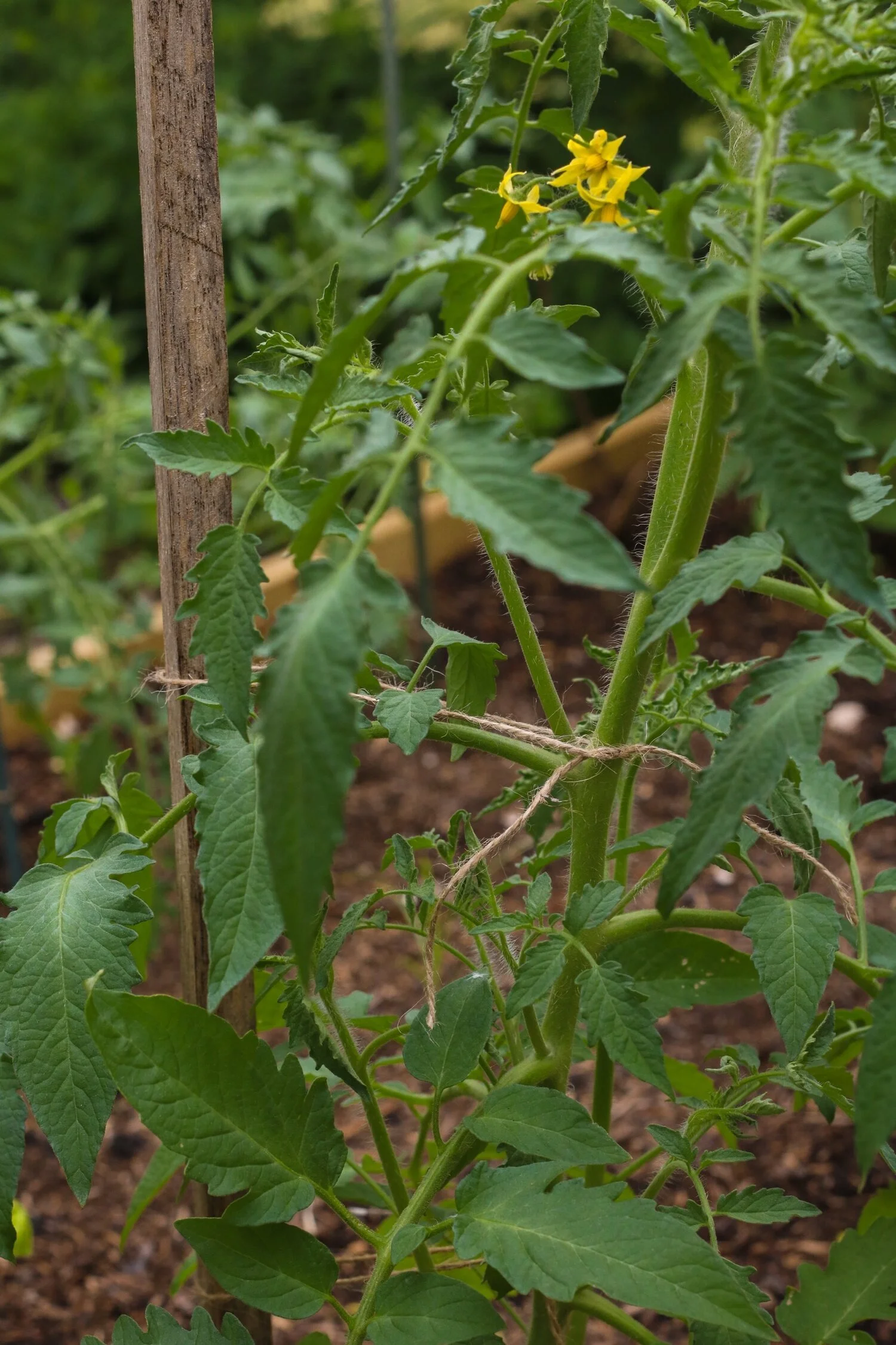 Start training when plants are young. It’s best to do this about a month after transplanting. Begin by tying your tomato to the structure of choice every 6-8 inches up the length of the plant from the main stalk. It is best to tie right above a cluster of flowers because the stalk may become pinched as the flowers develop into heavy fruit.
