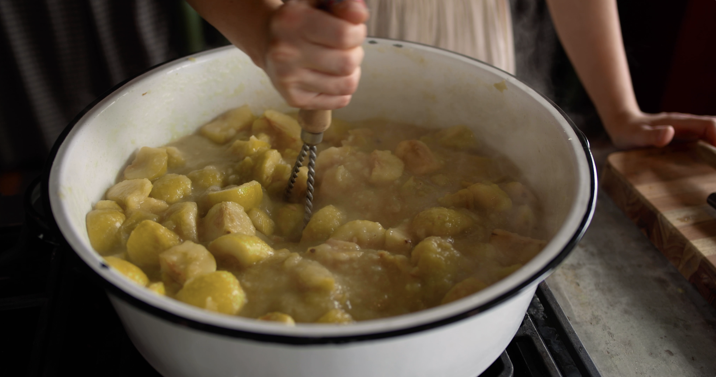 Step Two: Reduce the heat, cover the pot loosely, and boil gently for about 30 minutes or until the apples are softened. While cooking, gently mash the apples with a potato masher.