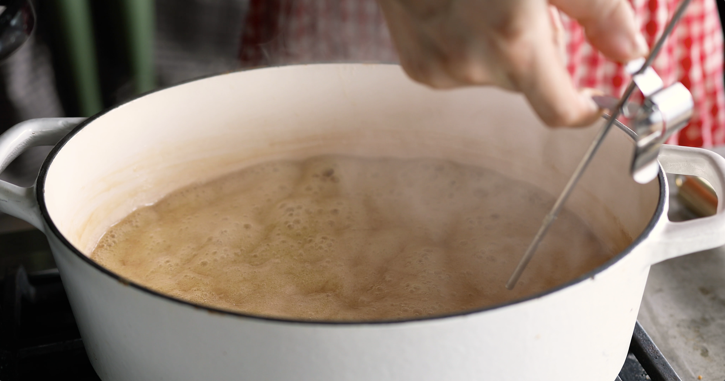 Step Seven: Boil the jelly hard, stirring frequently to prevent burning, until the mixture comes to the gel stage. The gel stage is achieved once the jelly has reached 220°F (104°C) at sea level when tested with an instant read thermometer. If you do not have an instant read thermometer, you can use the cold plate test or cold spoon test*.