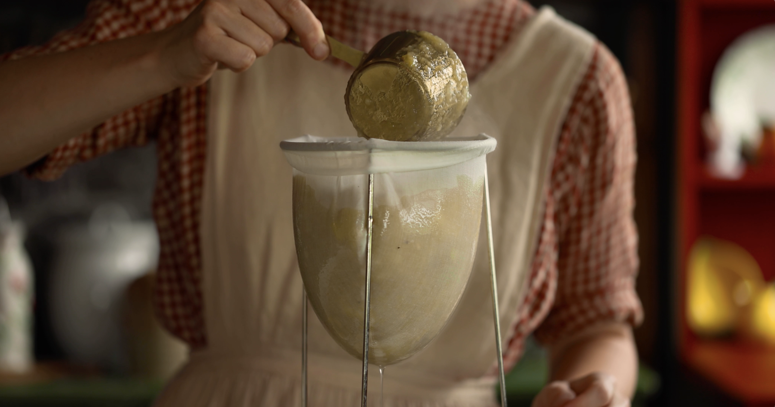 Step Three: Transfer the apple mixture to a dampened jelly bag or strainer lined with several layers of dampened cheesecloth set over a deep bowl. Leave the juice to drip into the bowl for at least 2 hours or overnight. Do not squeeze the bag - this can result in cloudy jelly!