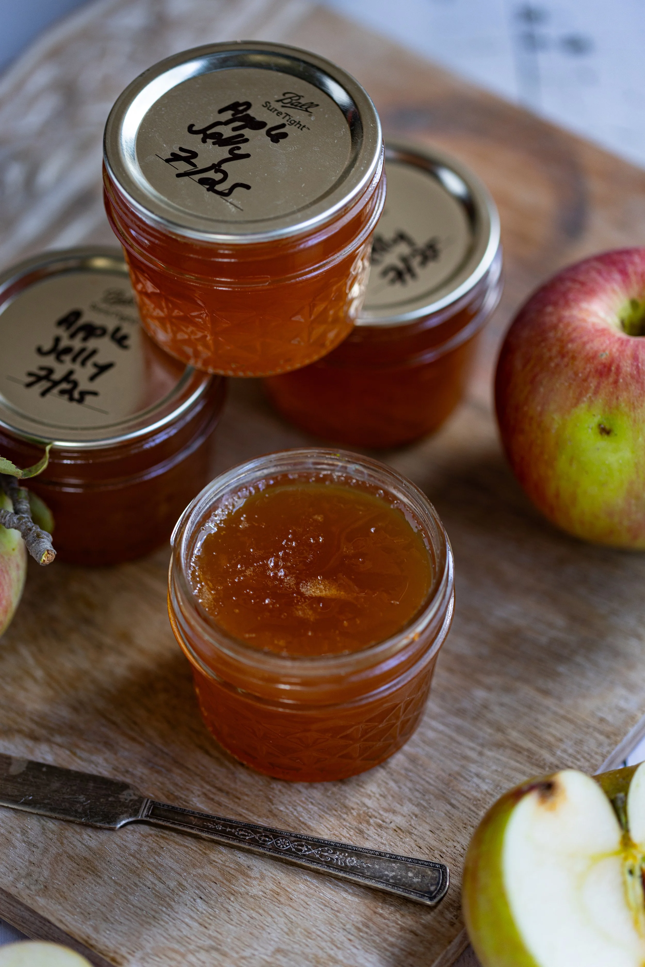 I personally prefer to use a “jam apple varieties” to make jelly because they’re not the best for eating fresh anyway. Try varieties like Crabapples, Yellow Transparent, Granny Smith, McIntosh, and Garvensteins.