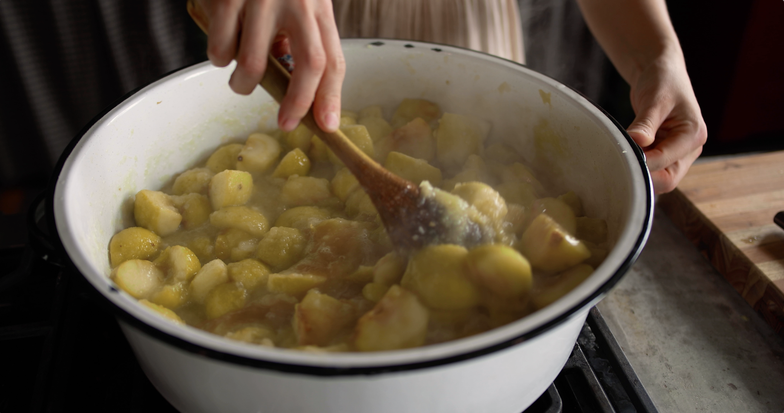 Use a wide, stainless steel or heavy bottomed pot to encourage even cooking and faster water evaporation.