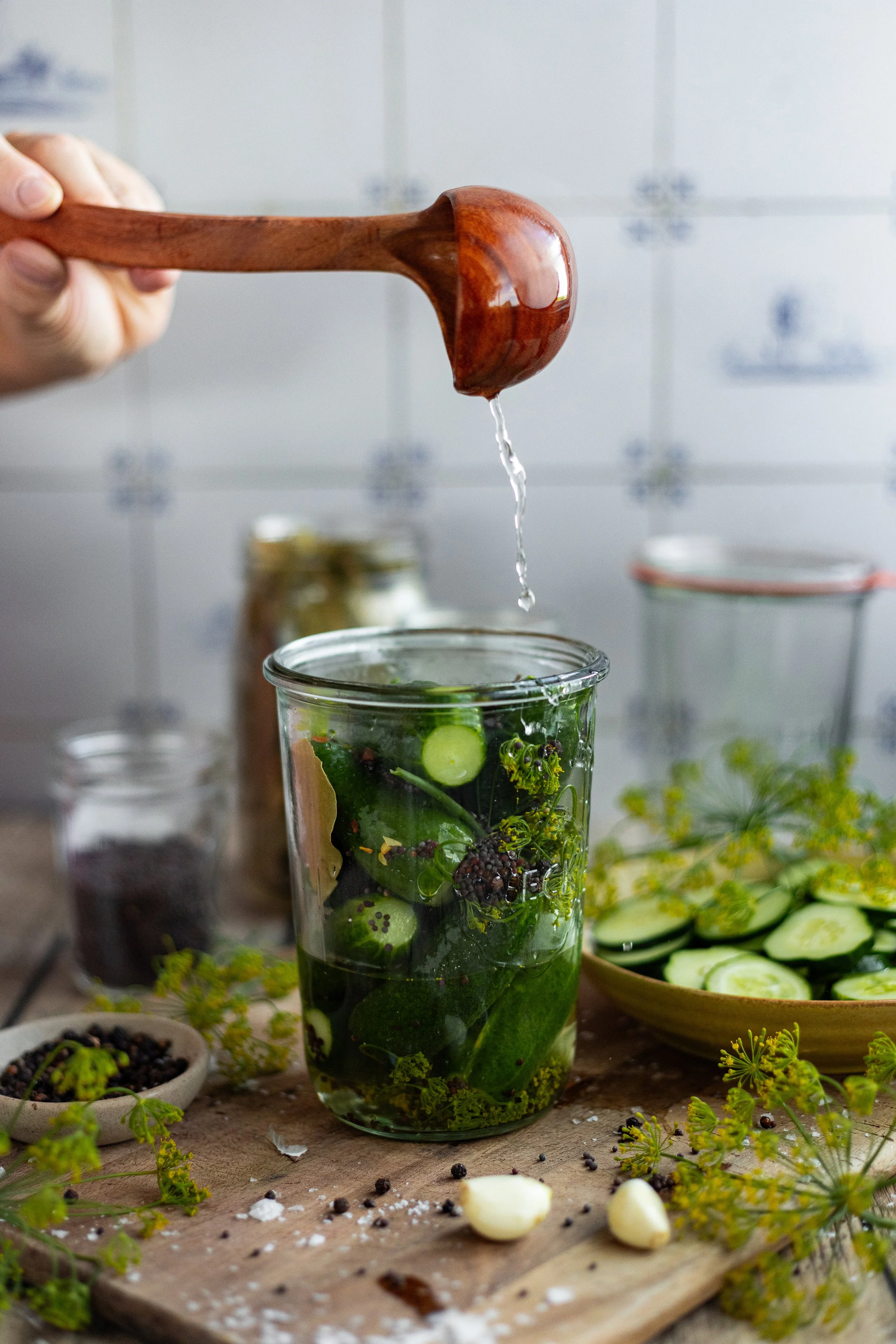 In all, pickle making is really personal. The amount of garlic, dill, and other flavorings are up to you! If you are canning, the general rule of thumb is 1:1 ratio of vinegar to water for safely canning pickles at the appropriate acid levels. I would always suggest using a USDA approved canning recipe, if possible.