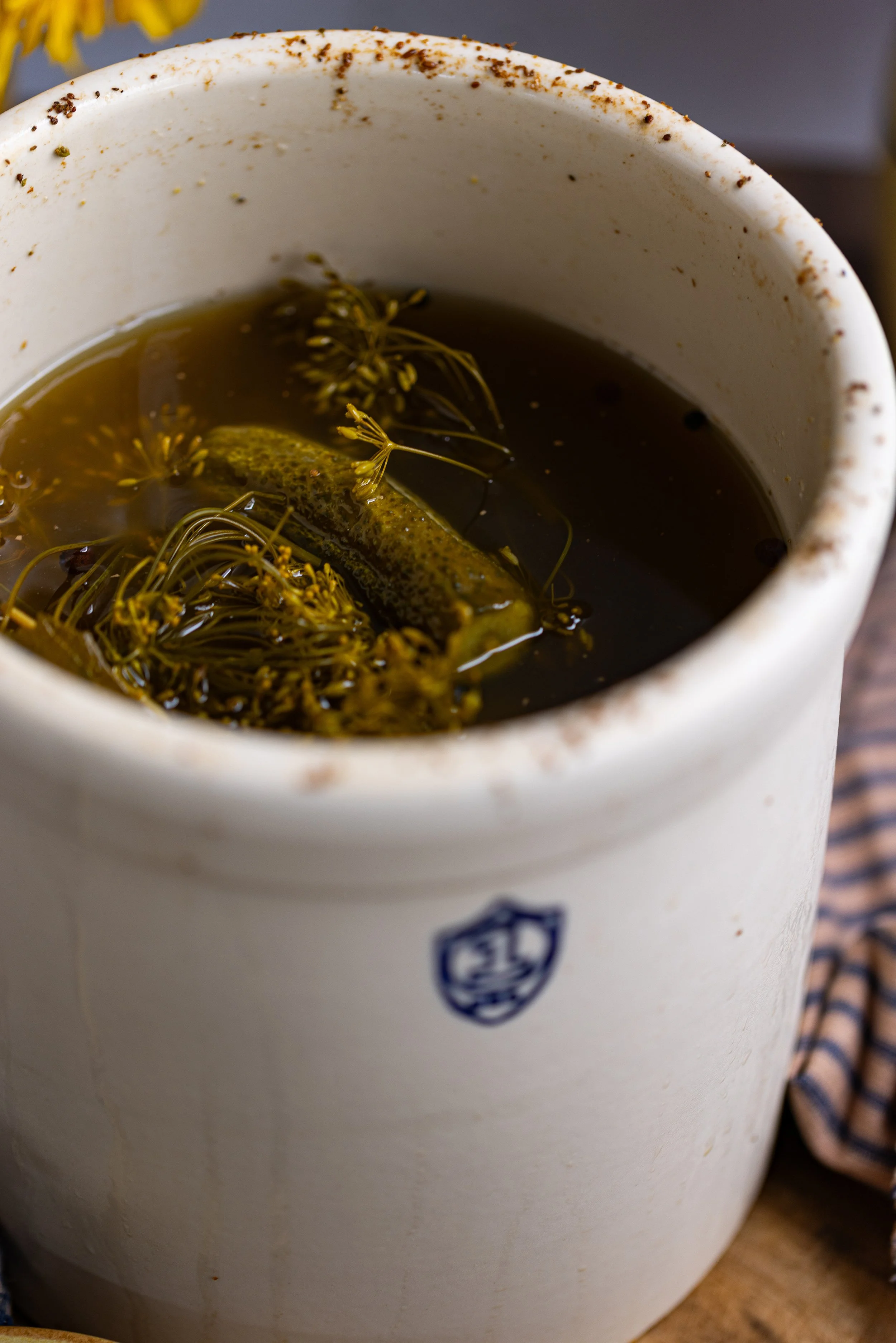 Keep your pickles fully submerged in the brine for the best flavor. Use fermentation weights to help keep your veggies under the brine.
