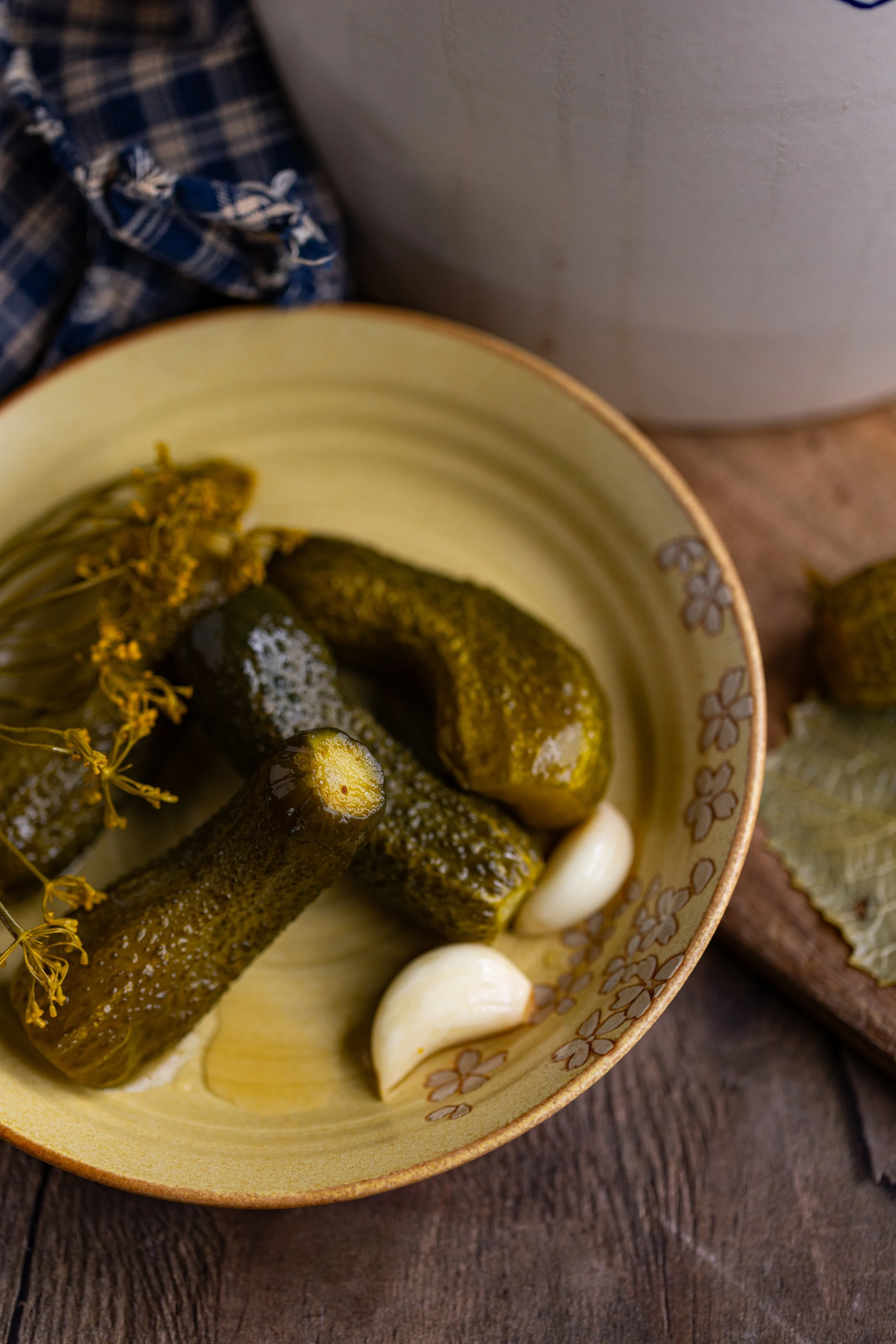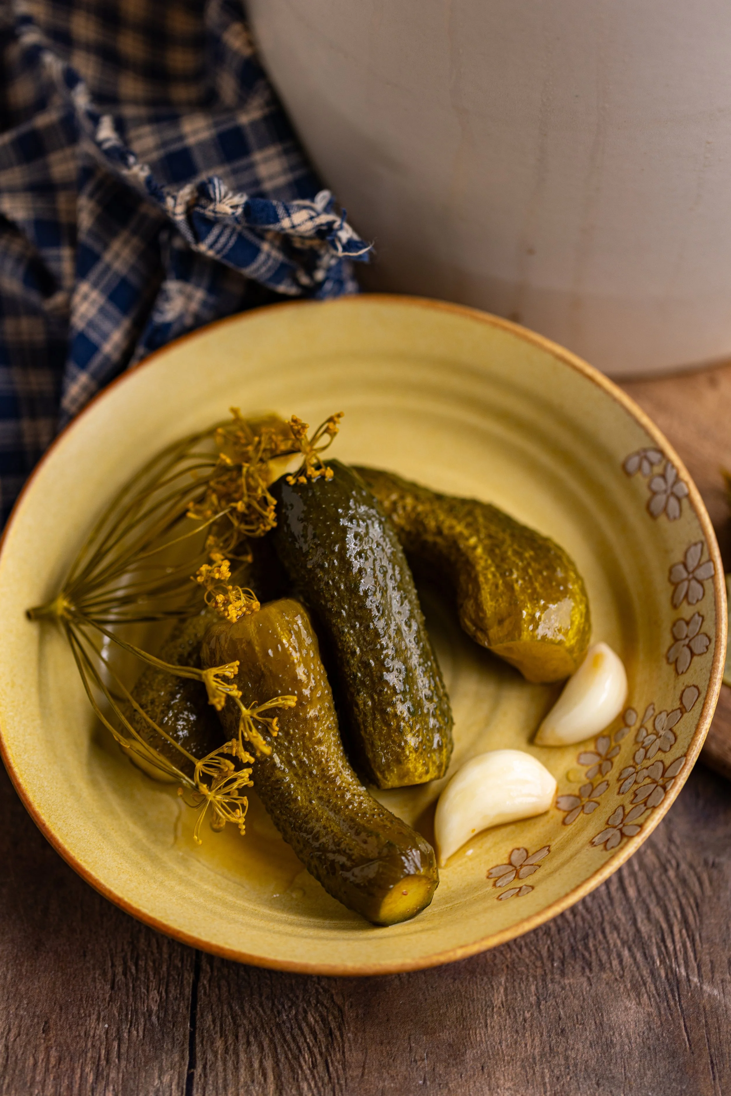 Fermented pickles are cucumbers, generally, that have been preserved through the process of lacto-fermentation. Preserving food with this method requires beneficial bacteria that converts the sugars in the food into lactic acid, which creates a tangy flavor. This acid also acts as a natural preservative, meaning that no vinegar is involved in the preservation process. Fermented pickles are not pasteurized, unlike pickles made with vinegar, and retain their probiotic properties. Fermented food is immensely healthy for your digestive system, making fermented pickles a fun option to try for both unique flavor and gut health!