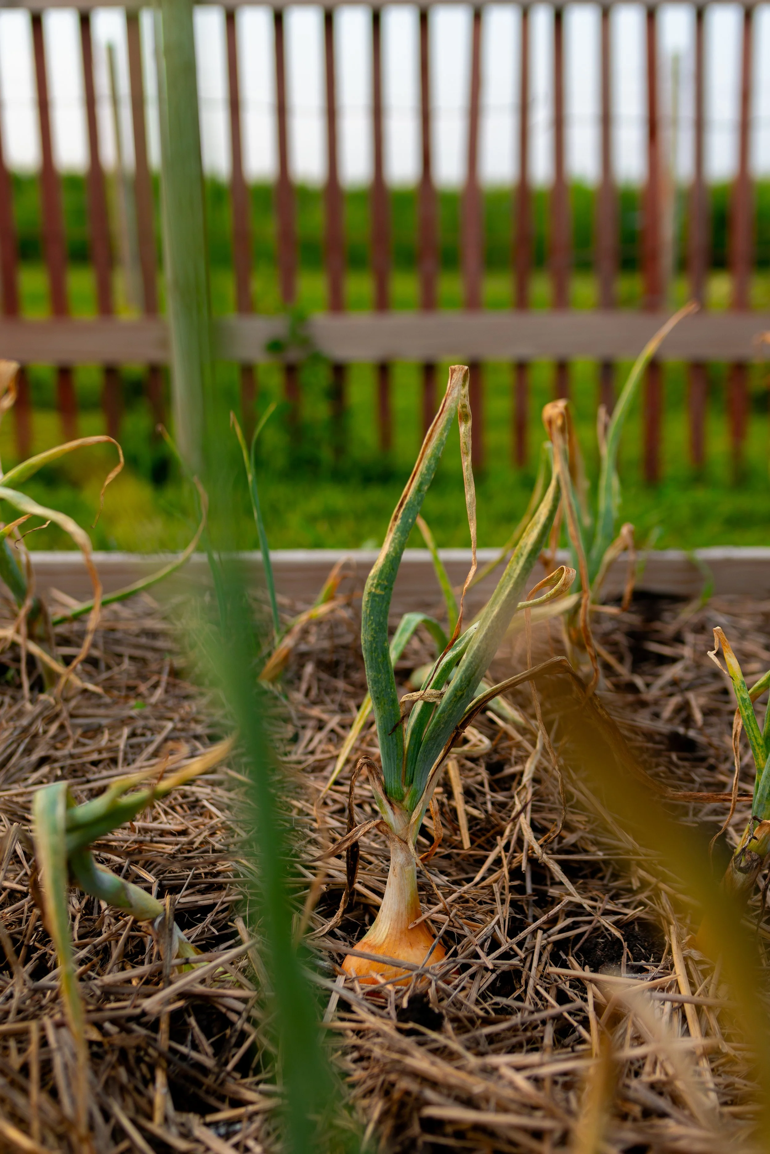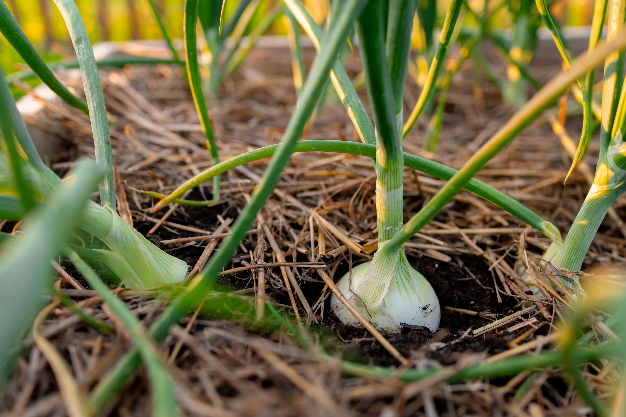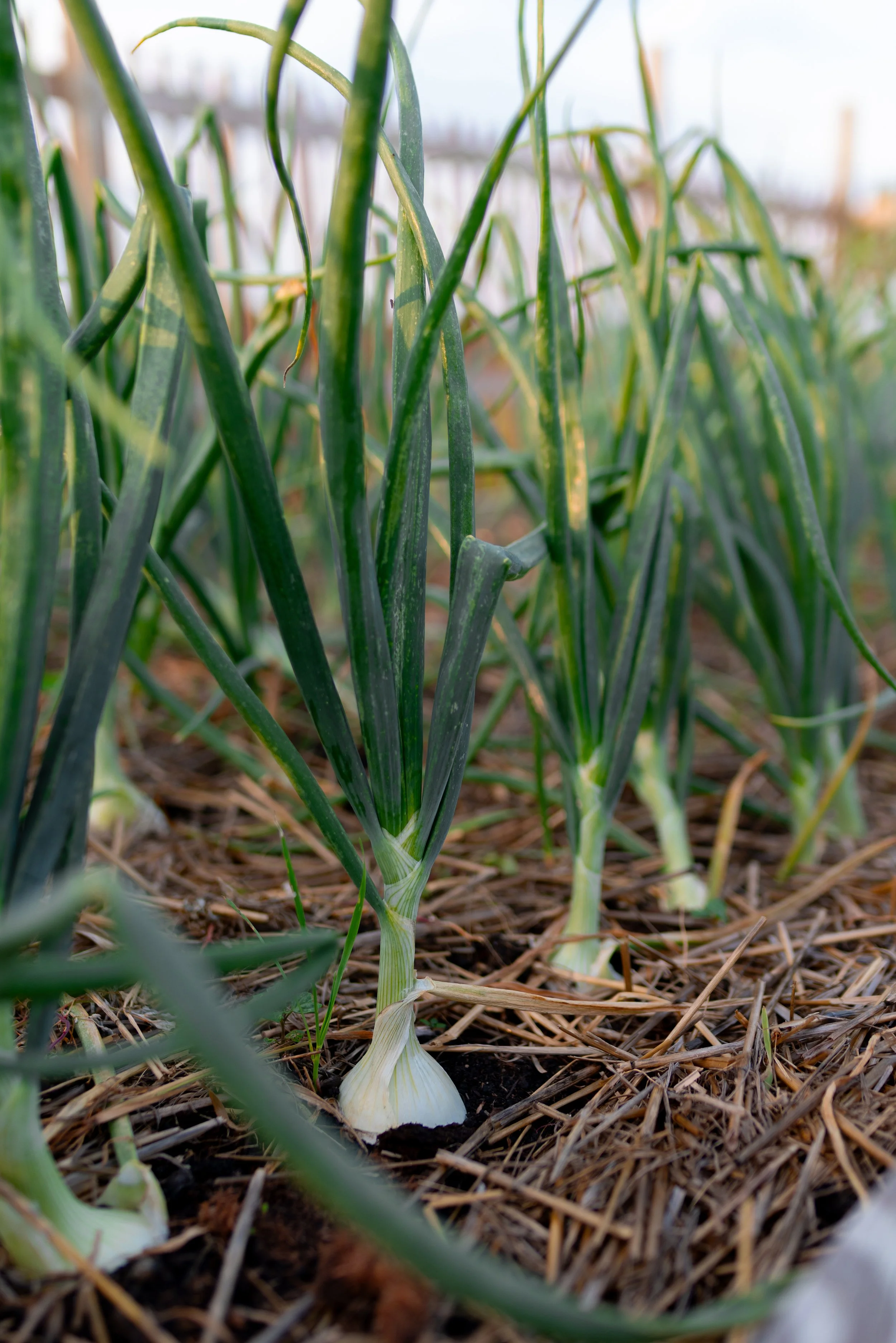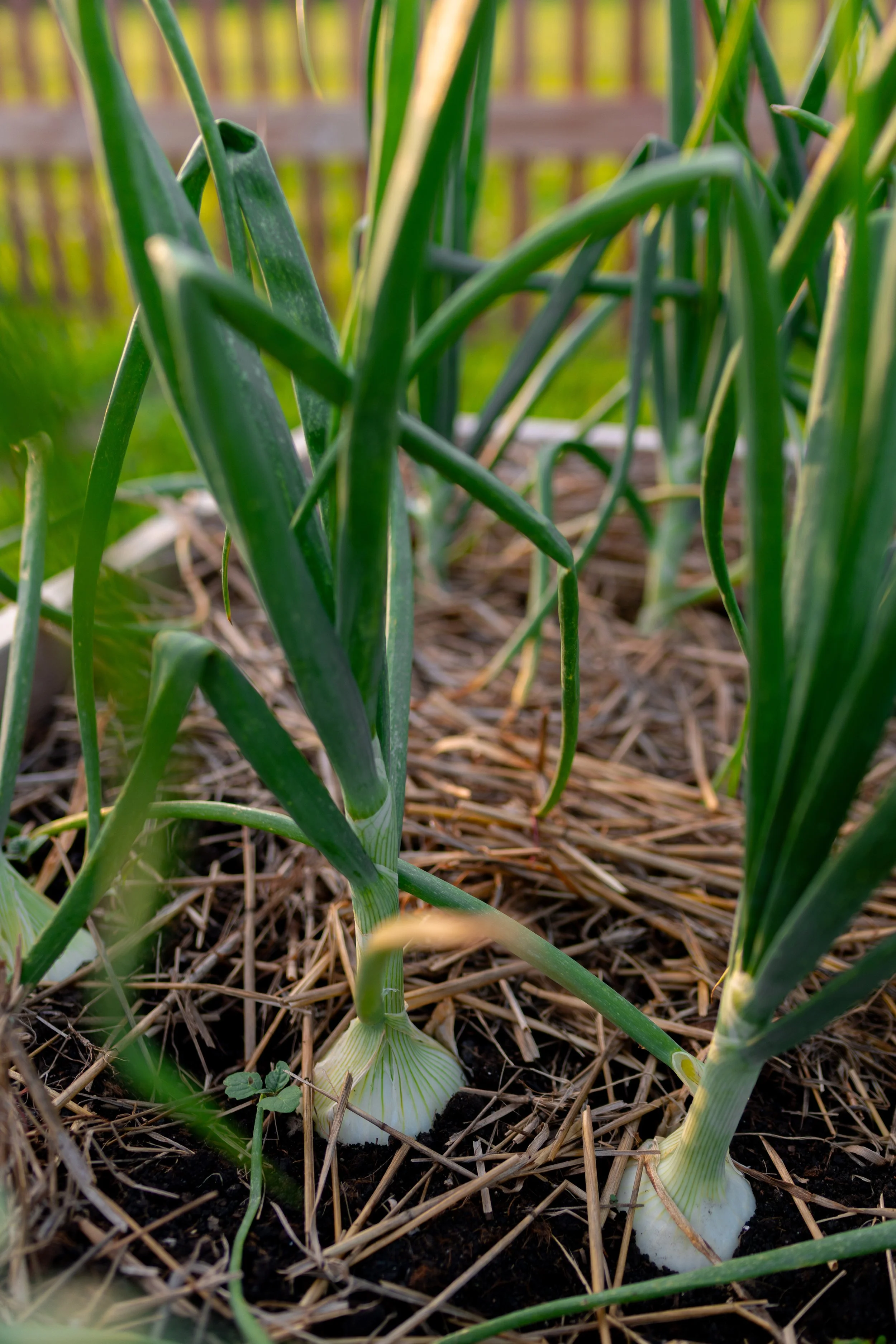 Straw Mulch— Onions need a light mulch, such as from straw or grass clippings. This helps protect them, suppress weed, retain moisture, and allow for air circulation. You should not cover the bulbs, so using a heavier mulch or plant fabric is not a good option.