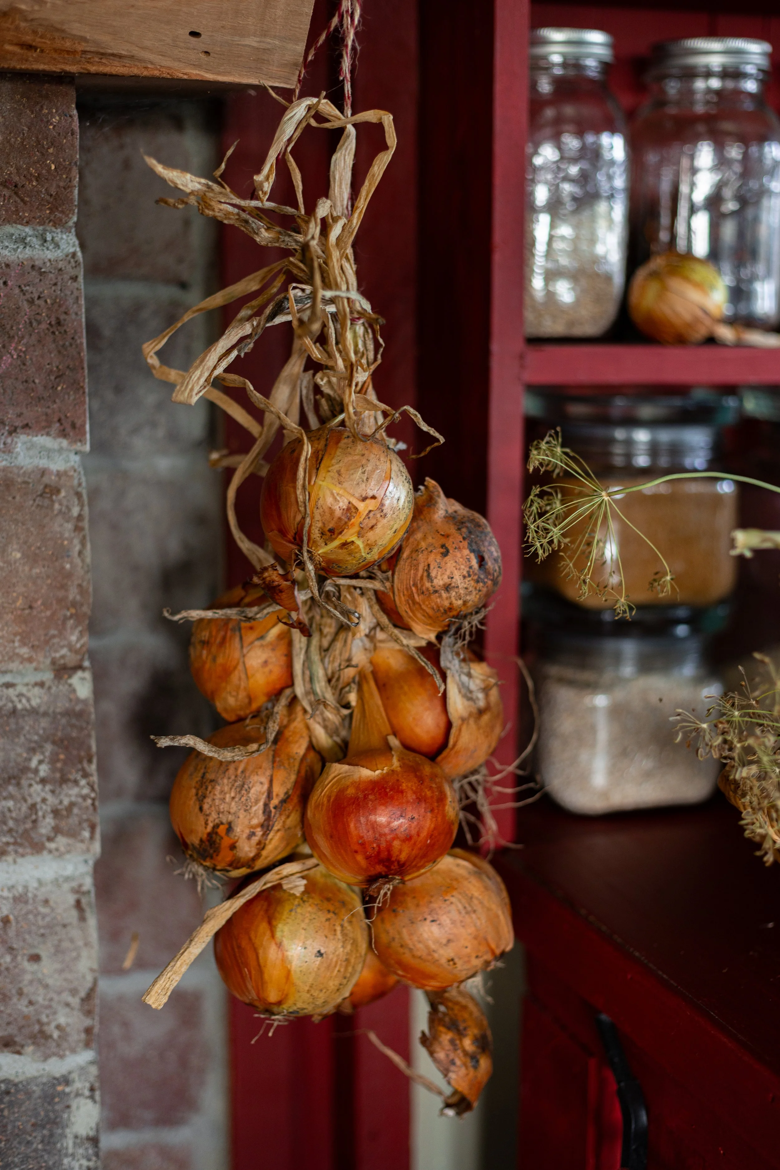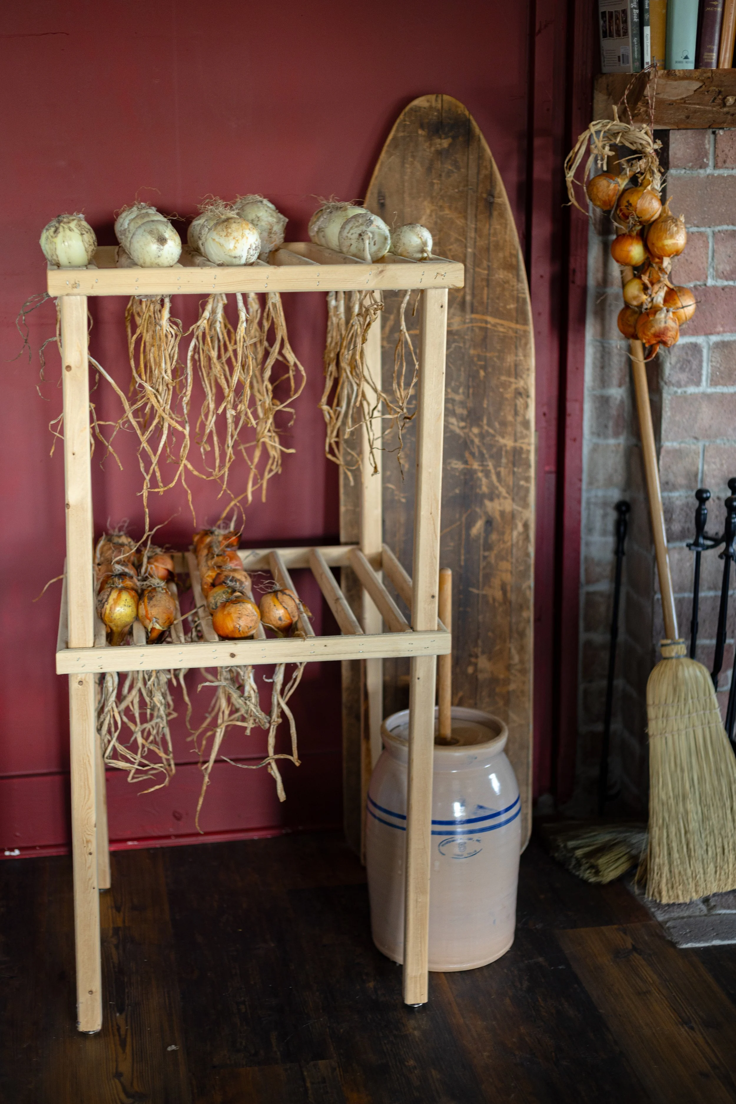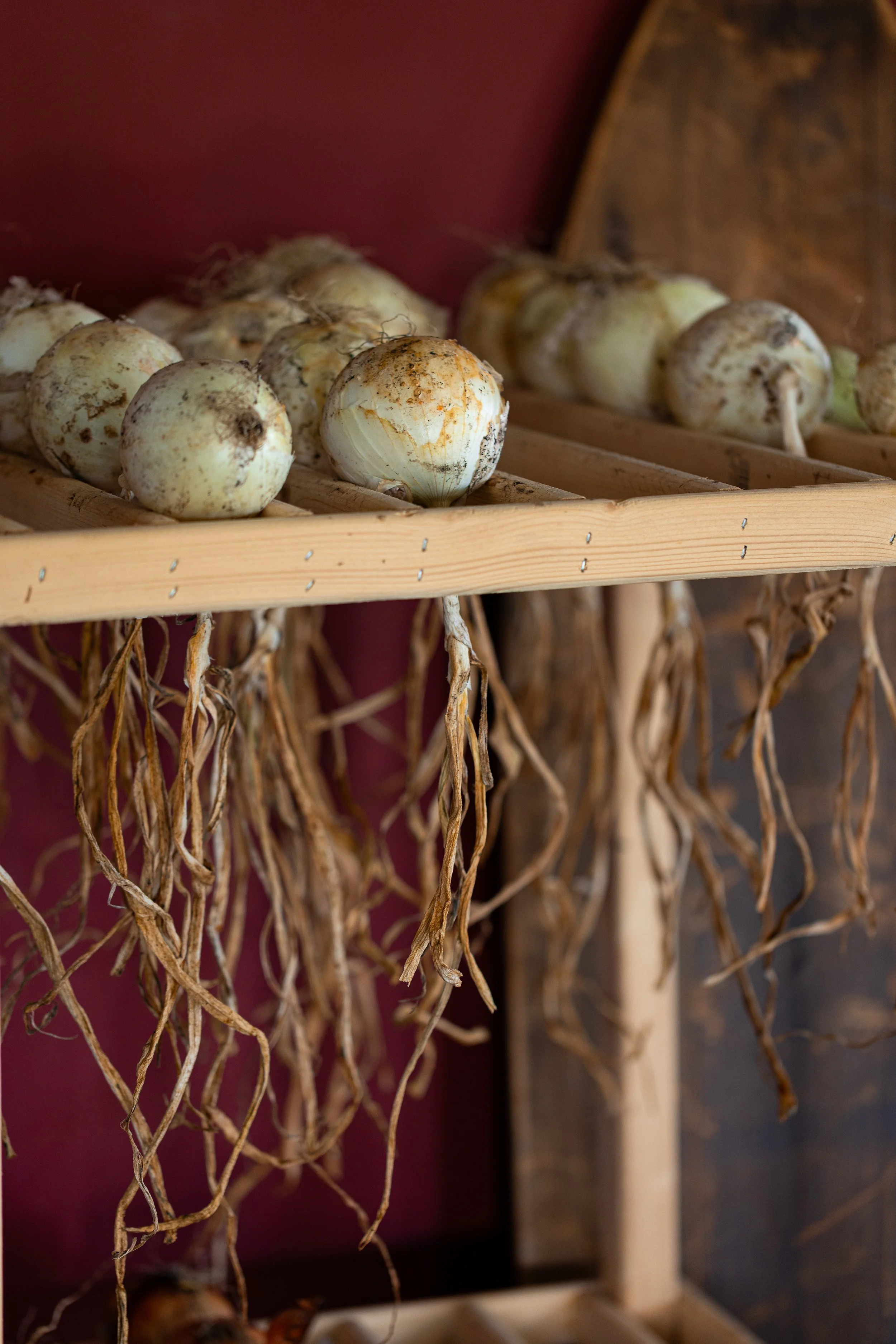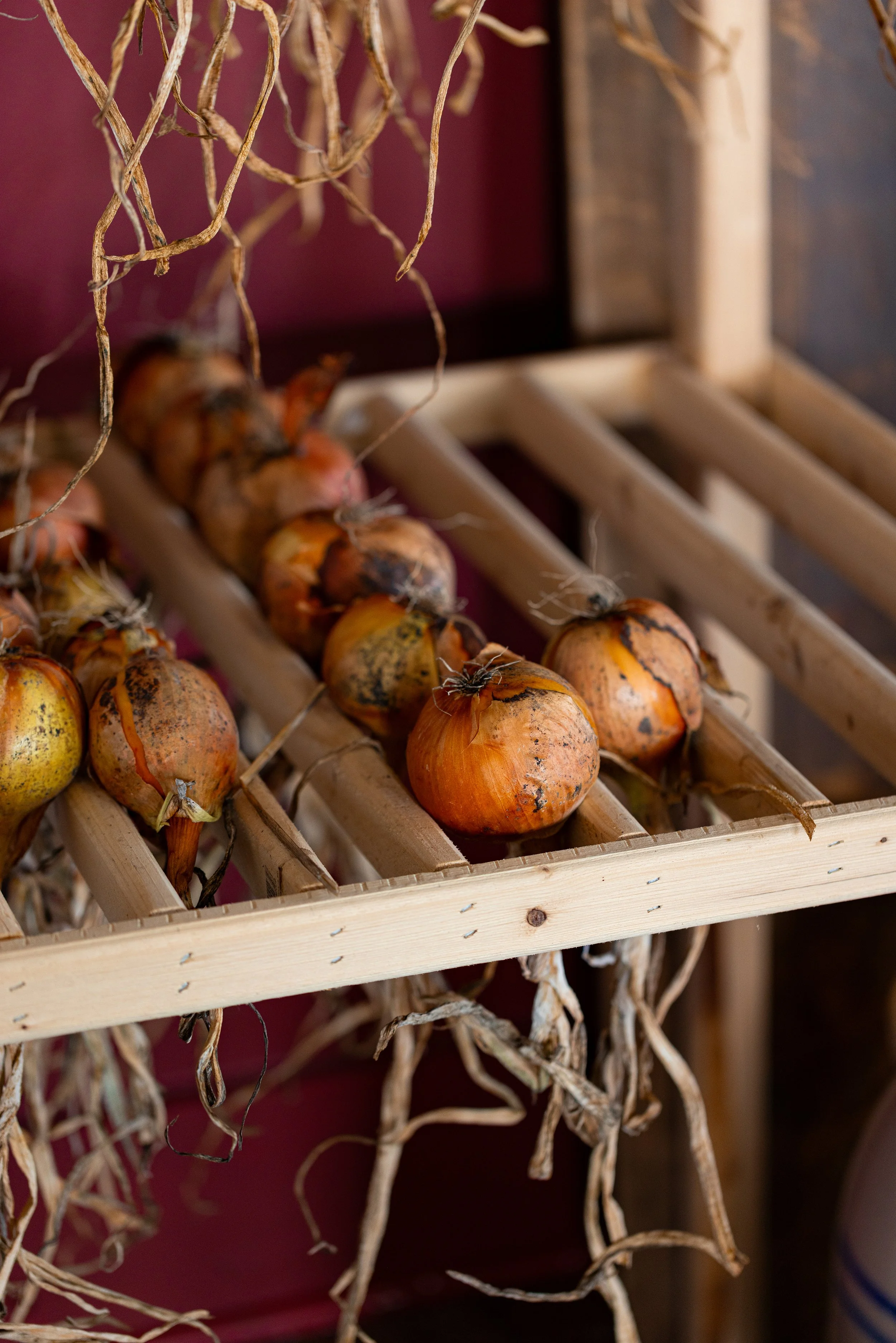 Hang to Dry: Hang the onions to dry, preferably upside down with the roots facing towards the ceiling. The onions should be dried in a well-ventilated, dry, and covered place that is out of direct sunlight. You can try making a homemade drying rack like the one in my photos! We made this one ourselves based on historical designs.