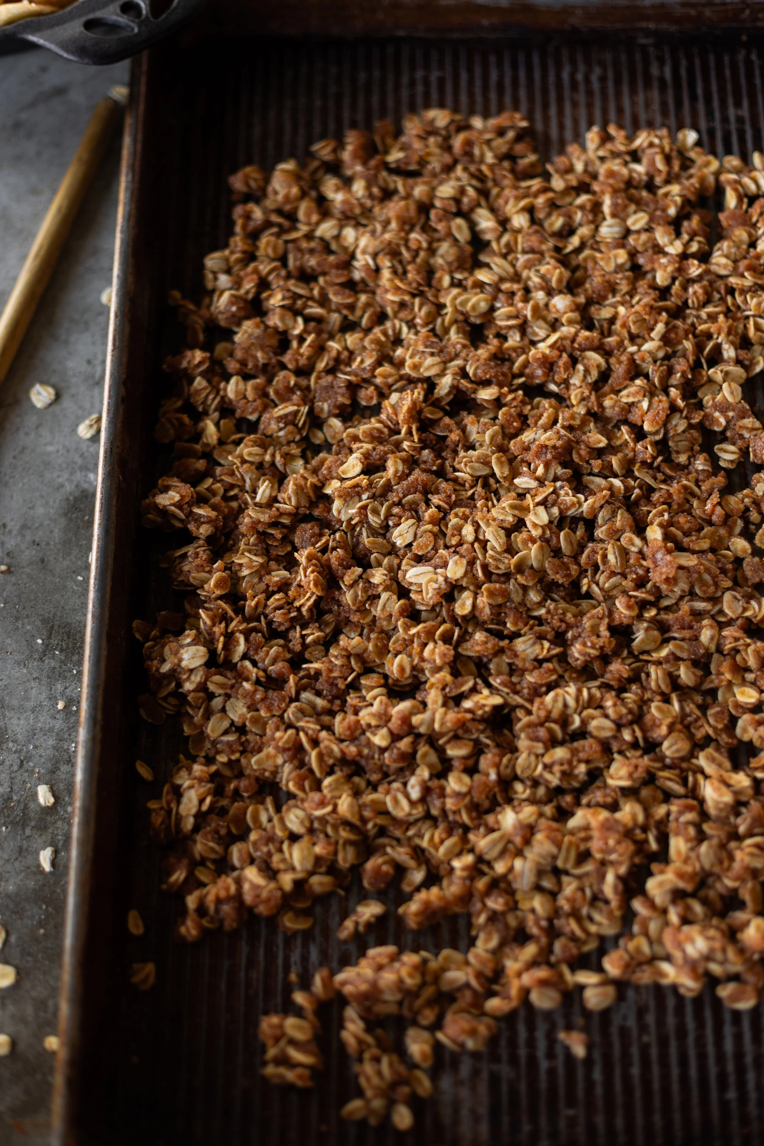 - Evenly spread the topping onto the prepared baking sheet. Bake in the preheated oven for about 5 minutes, or until lightly browned. Let cool slightly before transferring the topping to the baking dish with the apple filling. Spread the topping evenly over the apples.