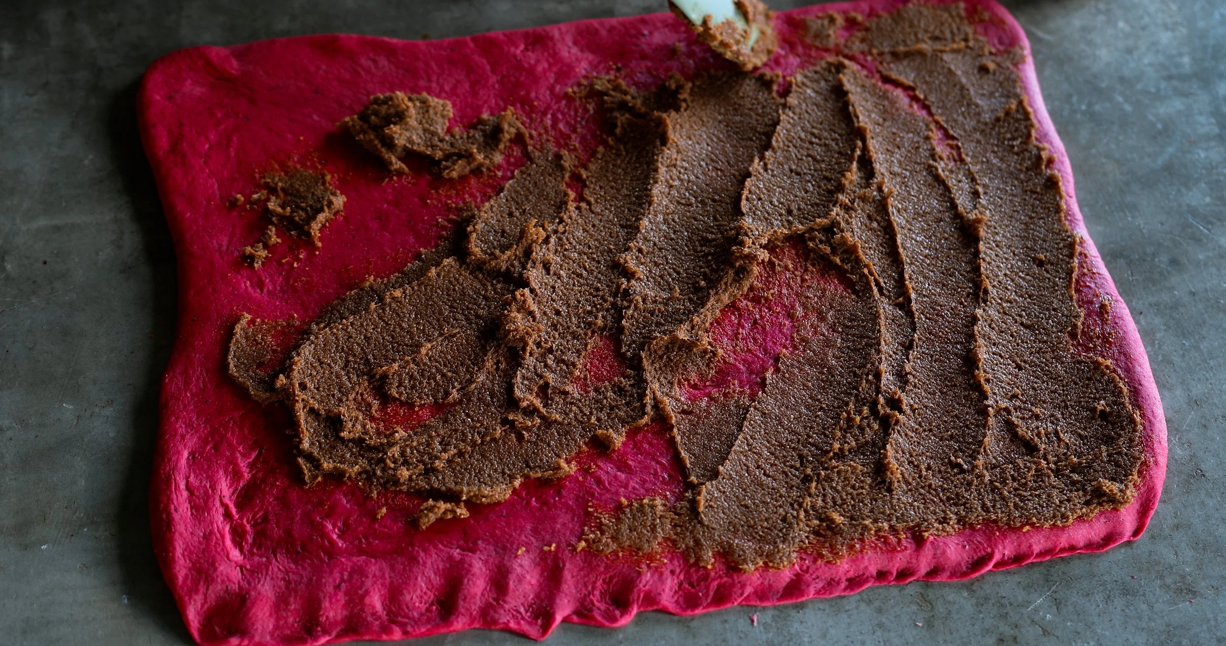 - Spread the cinnamon sugar butter all over the surface of the dough, reaching out to the edges and corners.