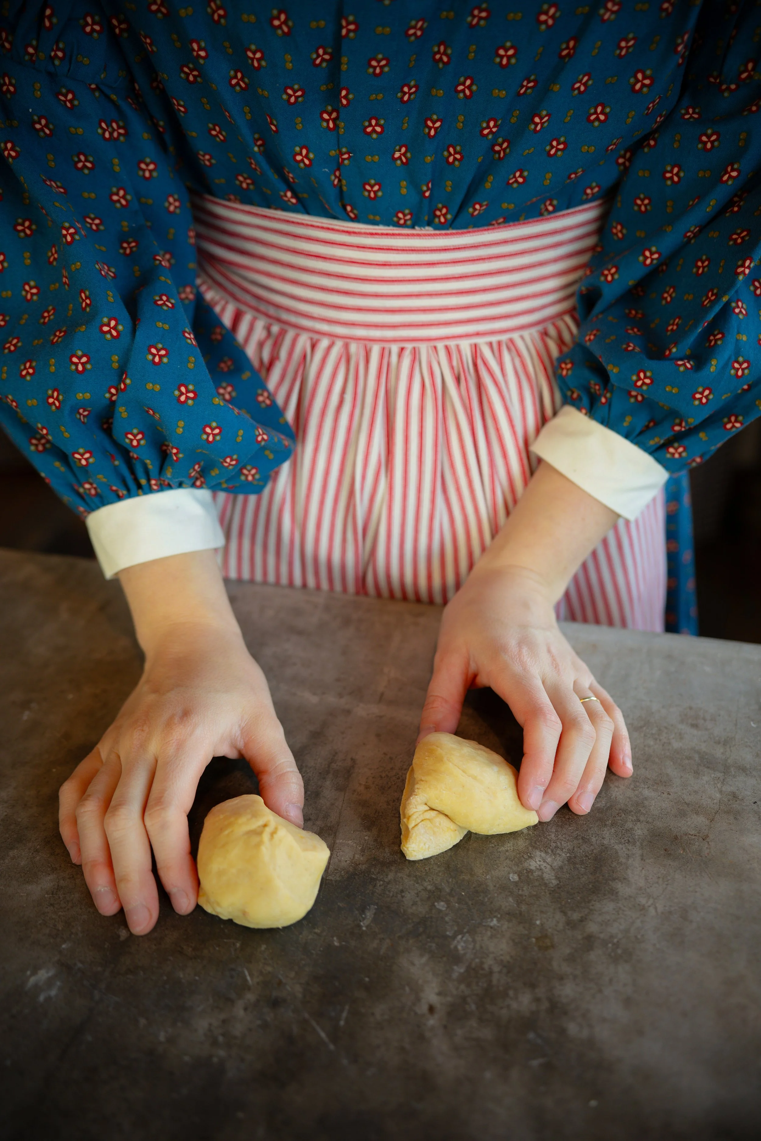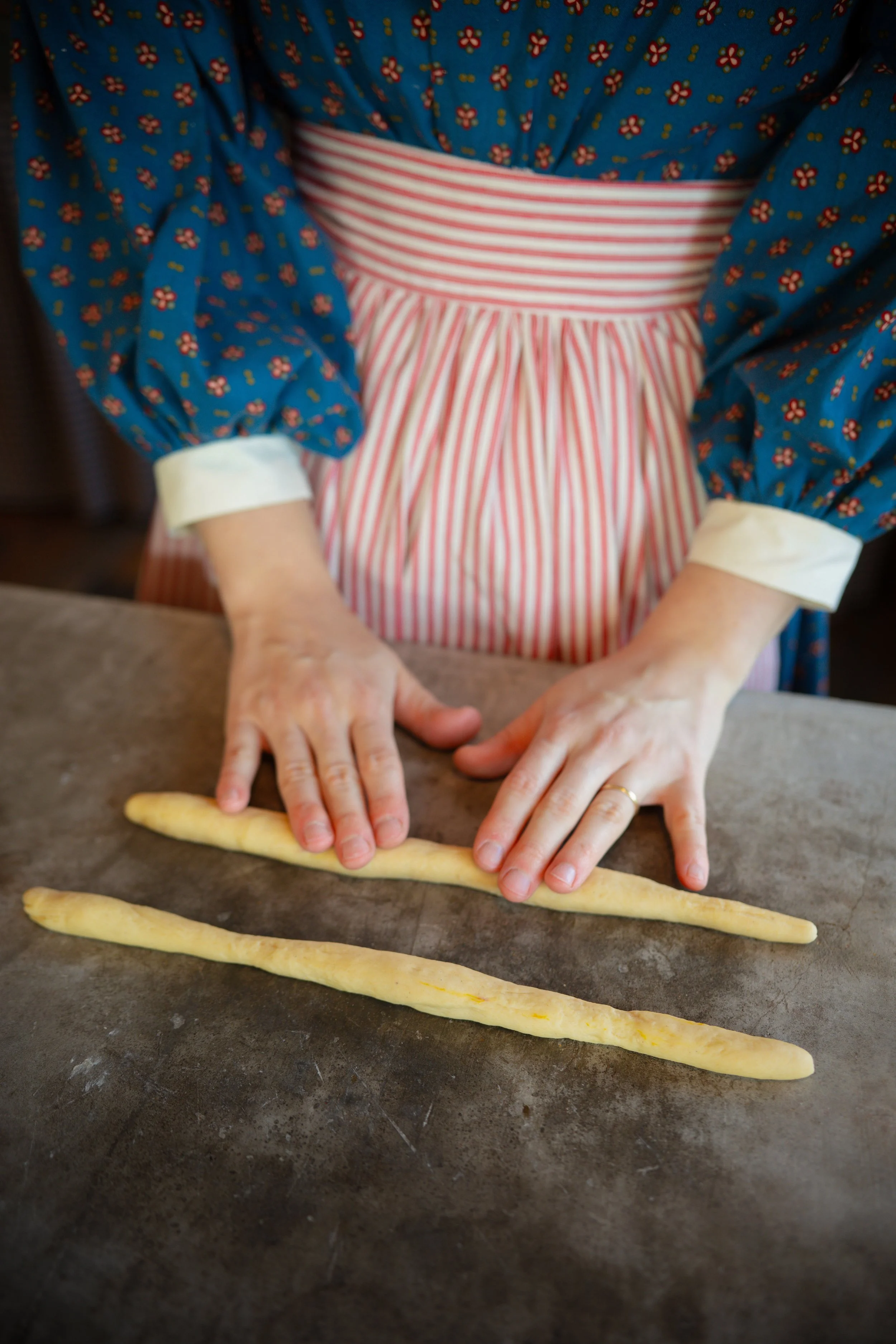 Begin by dividing the dough into 12 equal sized pieces. With 2 of the pieces, roll them out into 10-inch (25-cm) long snakes.