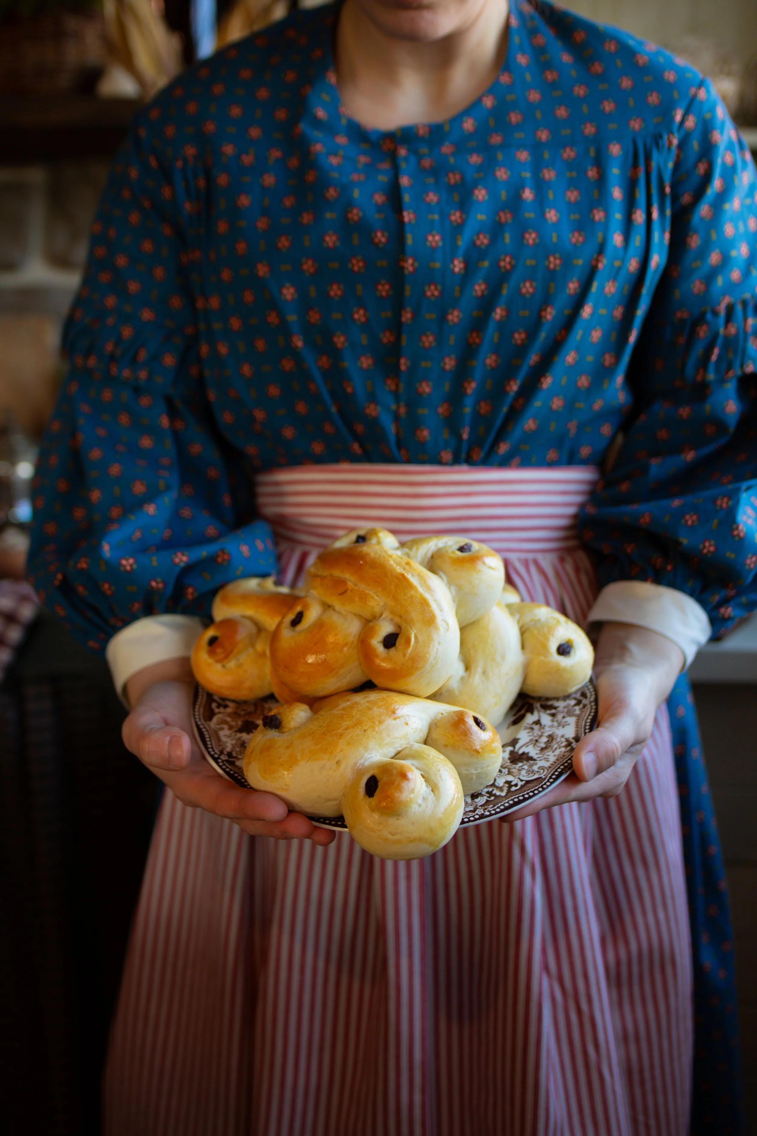 It is tradition for the eldest daughter to serve her parents with the baked saffron buns and hot coffee, bringing the tray around early in the morning before the first light comes up. December 13th once marked the winter solstice, the longest night of the year, though today we observe the solstice on December 21st or 22nd.