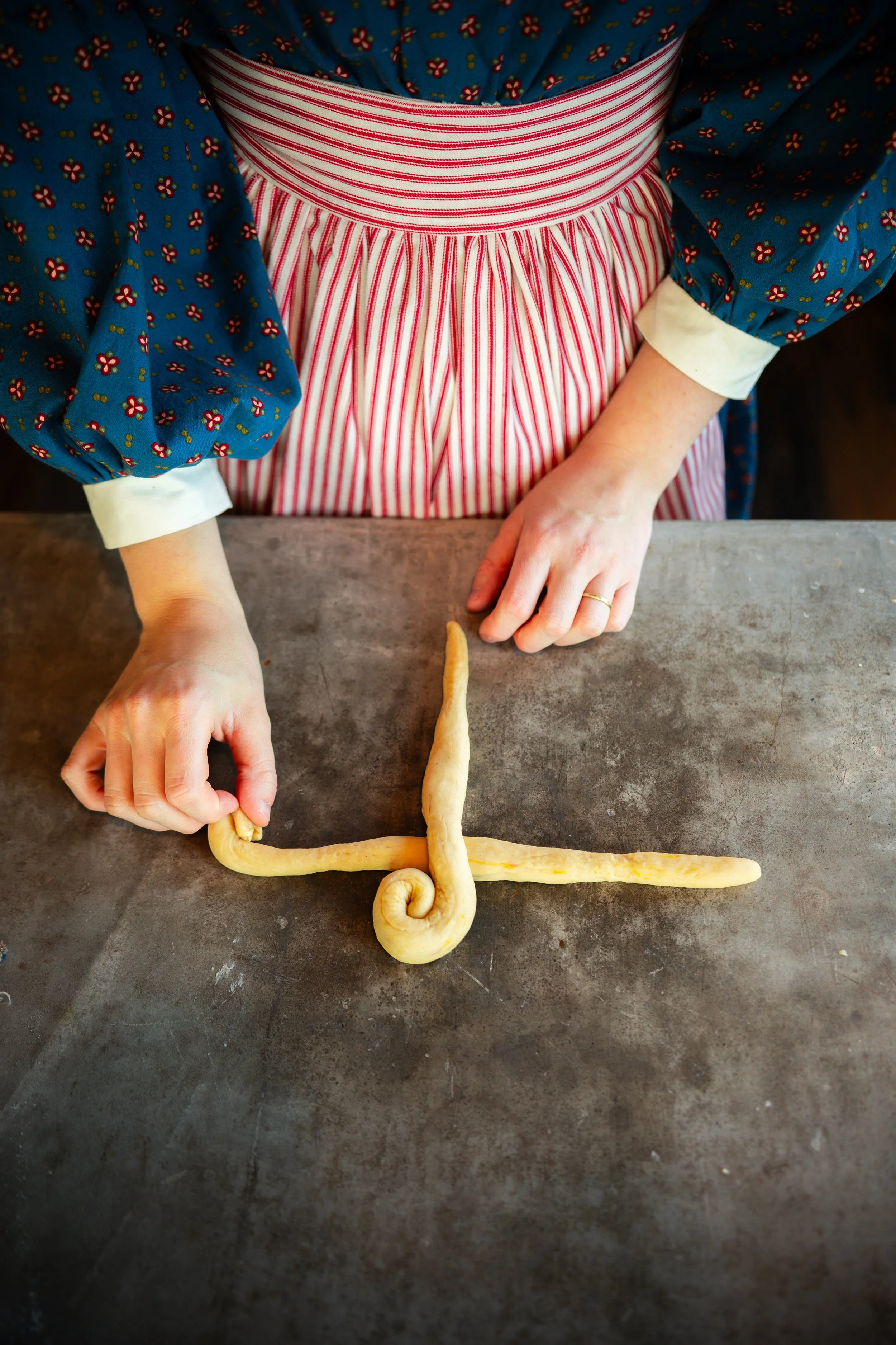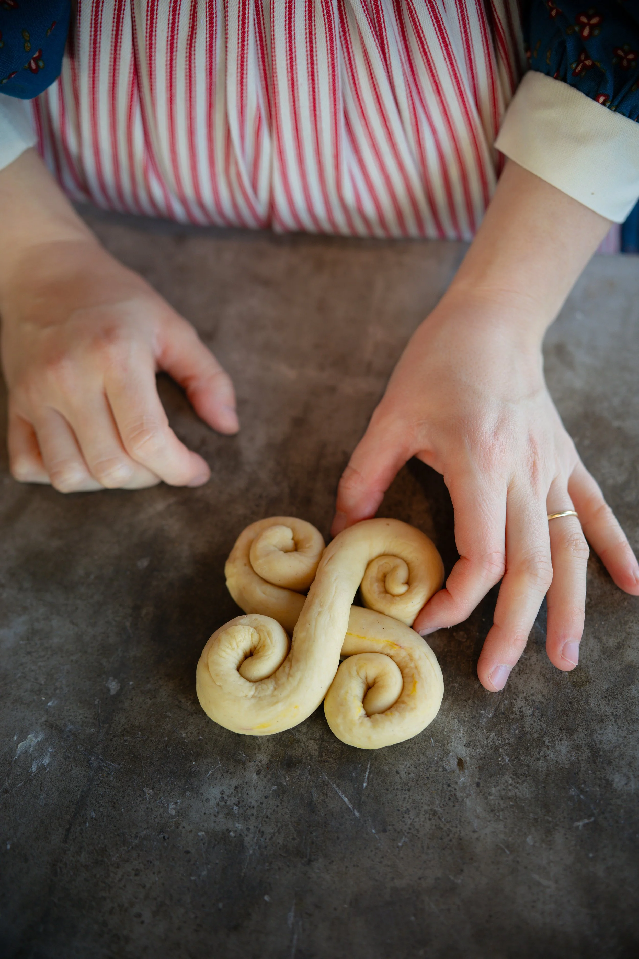 - Set aside a lightly greased baking sheet. With 2 pieces of dough, roll them out with your hands into 10-inch (25-cm) long ropes. Cross the ropes over each other, like a cross. Then, with the end of one rope, roll it towards the center of the cross, making a snail shape or spiral. Repeat this with the other four ends until it looks like a bit like a spiraled sun.