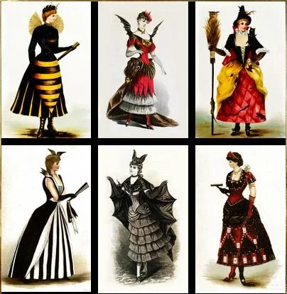 I loved looking into costumes that the Victorians would have worn. There are not many photographs, but there are several illustrations floating around from various magazines. They are incredibly elaborate, I must say, and I love that they turned their everyday clothing into themed costumes. Also, the themes of the costumes themselves are just so funny to me. Above, you can see women dressed as a bumblebee, a deck of cards, and a bat.